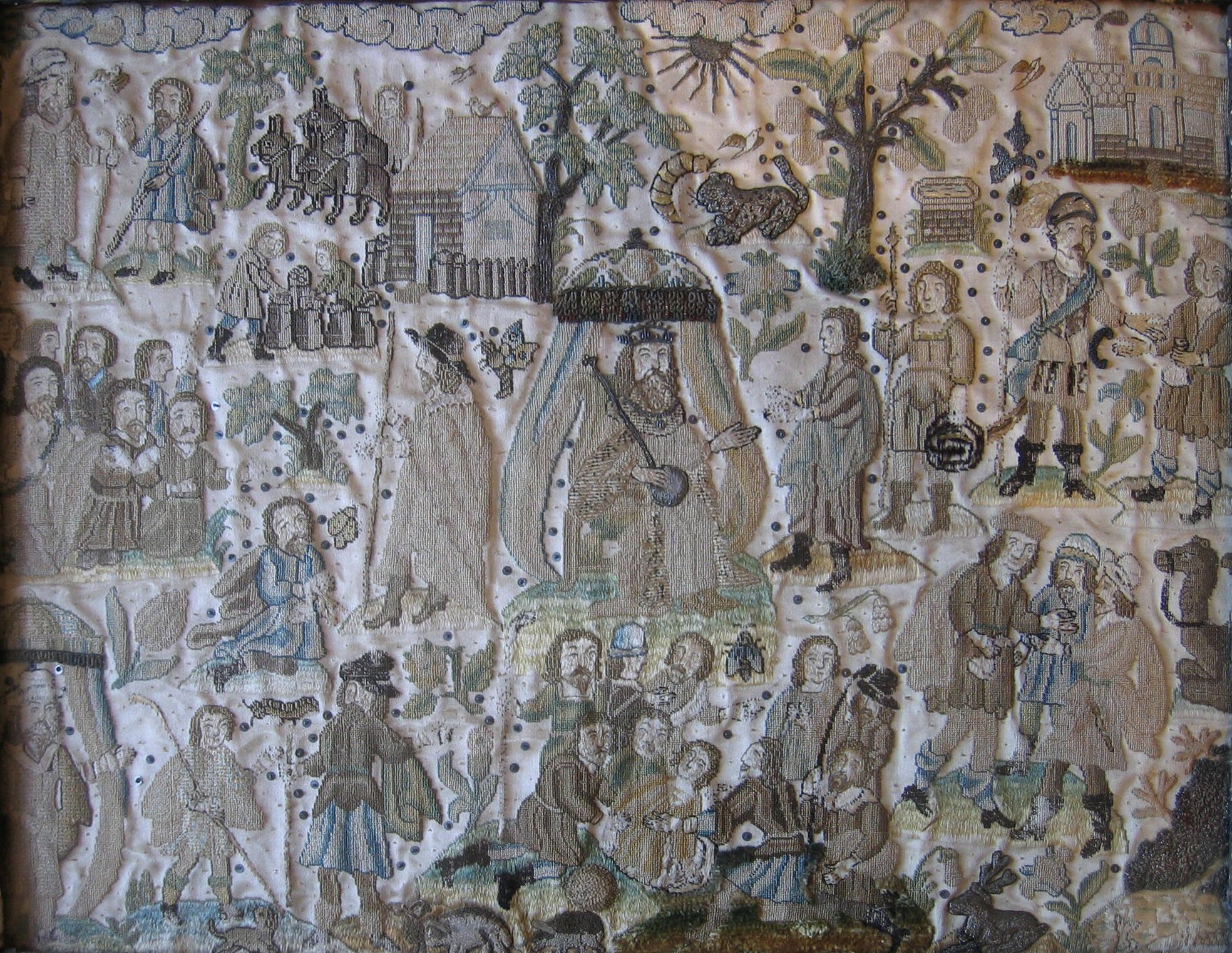 worked in coloured silks, silver threads, and with applied sequin decoration on a cream satin ground, depicting the story of Joseph, framed and glazed