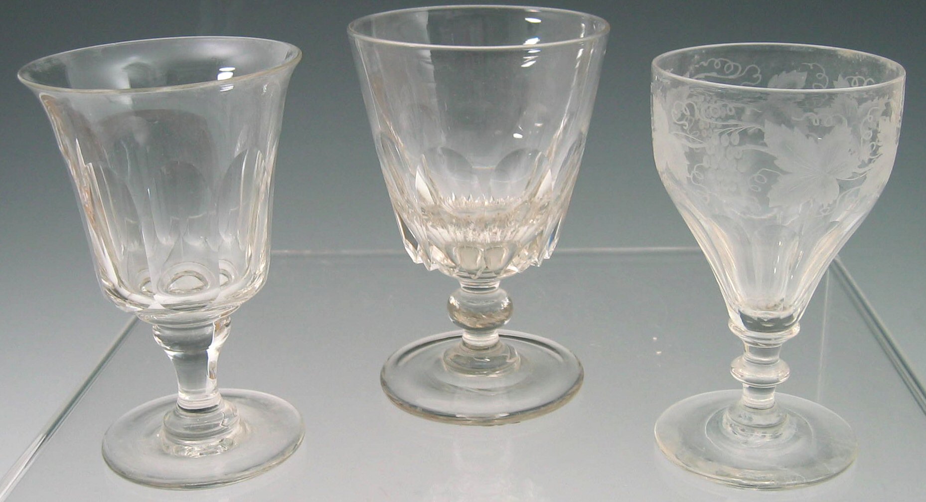 two pairs with flared bowl with faceted thumb cut body, over plain knopped stem and circular foot; one of conical shaped etched with vine leaves and grapes above thumb cut section, the stem with two knops above circular foot; and ten others (15)