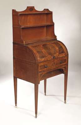 wih two open bookshelves above cylinder bureau enclosing fitted interior, drawer and kneehole drawer, on square section tapering legs with brass caps and castors