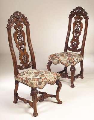 each with leaf carved and pierced scrolling top rail above corresponding splat, stuffover seat with shaped apron, carved cabriole legs with pad feet joined by waved and carved moulded stretchers (5)