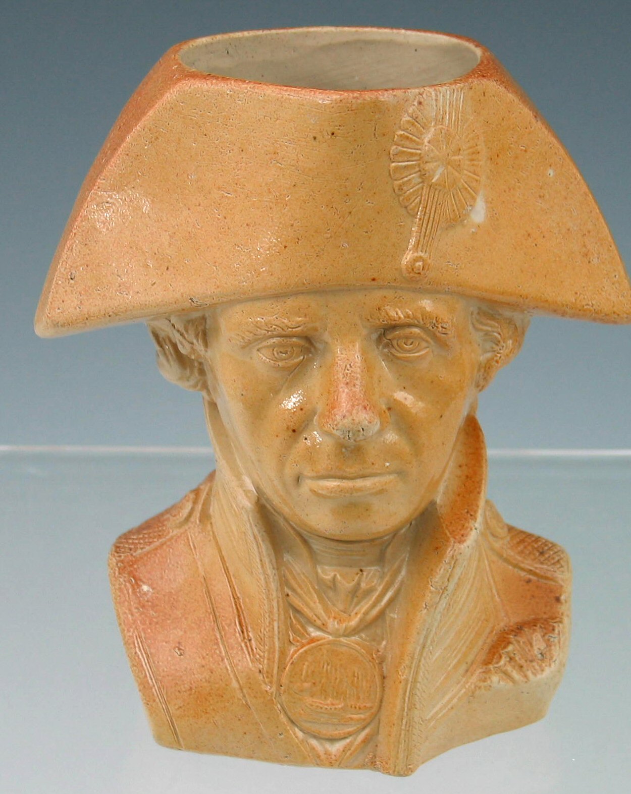 moulded as the head and shoulders of Vice-Admiral Horatio Nelson (1758-1805), in uniform and wearing a hat, with a rope twist handle, impressed marks
