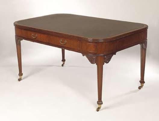 the rectangular top with rounded angles and reeded edge, enclosing gilt tooled leather skiver, above panelled frieze with two drawers to each side, raised on square section tapering moulded legs with scrolled and carved brackets, block feet with brass caps and castors