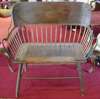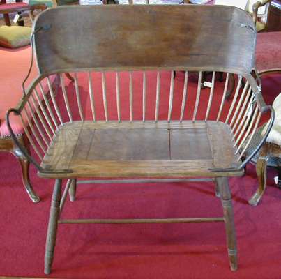 adapted to a settle, the tablet back with iron supports above spindled gallery and arms, the planked seat on splayed turned legs joined by stretchers