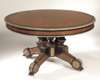 with gilt brass mounts, the circular top with corresponding frieze raised on four baluster pedestals with central finial, cross base with square tapering legs and drum feet with applied acanthus mounts and castors