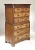 the projecting cornice with Greek key frieze above blind fretwork panel and two short over two long graduated drawers, enclosed by fluted angles, the base with three long graduated drawers raised on bracket feet