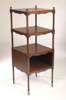 with three square open shelves and one enclosed shelf, on turned supports with urn finials, brass caps and castors