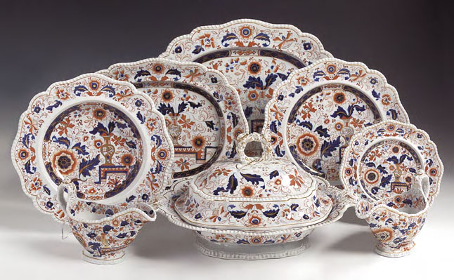with scalloped and gadrooned rim, printed in underglazed blue and painted in rust and gilt with a baluster vase and with meandering flower heads, comprising: six oval serving dishes of various sizes, largest 56cm wide, smallest 28.5cm wide; one tureen and cover; two sauce boats; nine side plates; ten fish plates; twenty-eight dinner plates; nineteen dessert bowls; and ten soup bowls, printed mark "Stone China, 66", ten plates with additional impressed mark "Ashworth real ironstone china" (86)