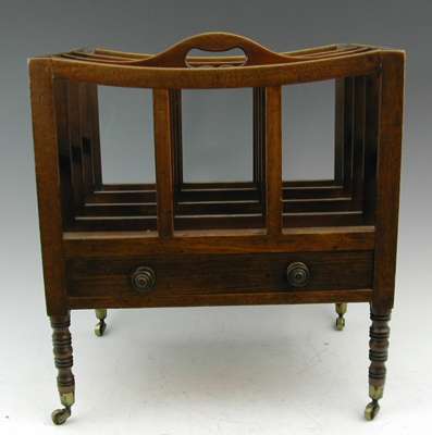 with five concave slatted dividers above a single drawer, on ring turned legs terminating in brass caps and castors