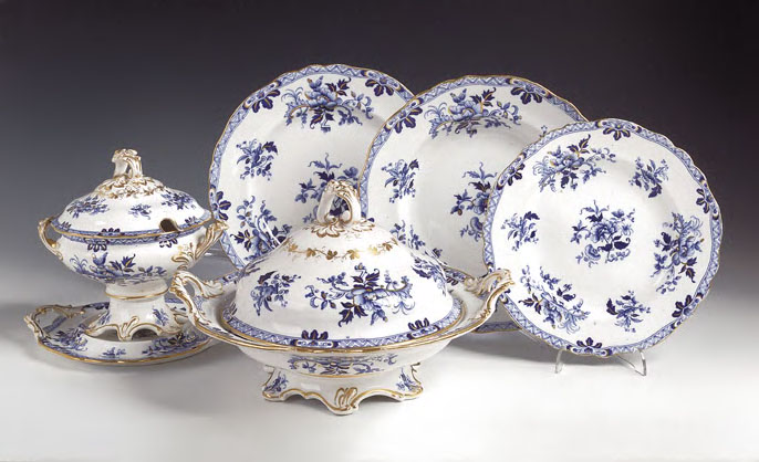 with scalloped edges and gilt line, geometric pattern to the rim and underglazed with flower sprays in blue with gilt highlights, comprising: a large twin-handled soup tureen, cover and stand with Rococo flower cast handle; a pair of matching sauce tureeens, covers and stands; a pair of footed twin-handled vegetable tureens and covers; twelve dessert plates; eleven soup bowls; and twenty-two dinners plates, with printed mark and rust painted pattern number 8939 (53)