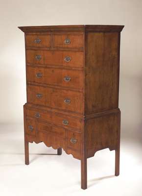 with chequer stringing, the moulded cornice above two short and three long graduated drawers, the stand with arrangement of four drawers above shaped apron, on moulded square section chamfered legs