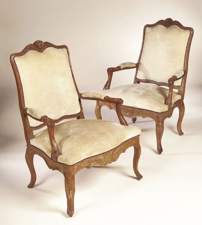 in the provincial Louis XV manner, each with moulded and carved scrolling frame, the top rail and apron centred by shells, on cabriole legs (3)
