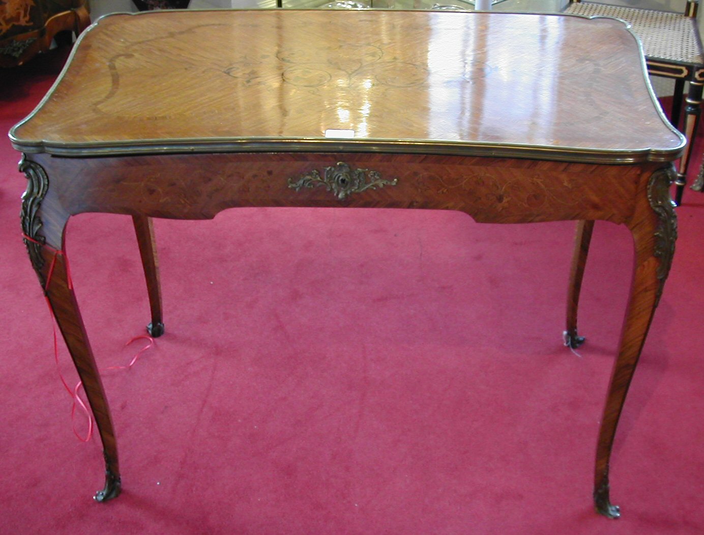 with kingwood crossbanding, the shaped rectangular top with brass edge, above frieze drawer and square section cabriole legs with gilt brass mounts and sabots