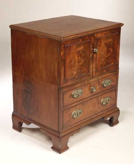 the rectangular top with moulded edge above a pair of panelled doors and false-fronted commode stool, on ogee bracket feet