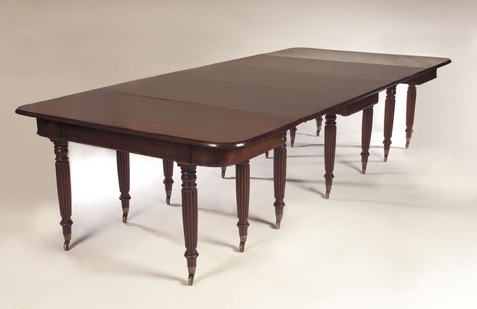 the rectangular top with rounded edge and angles above plain cockbeaded frieze, comprising central gateleg section with six legs and a pair of D-ends, the legs turned and reeded with brass caps and castors