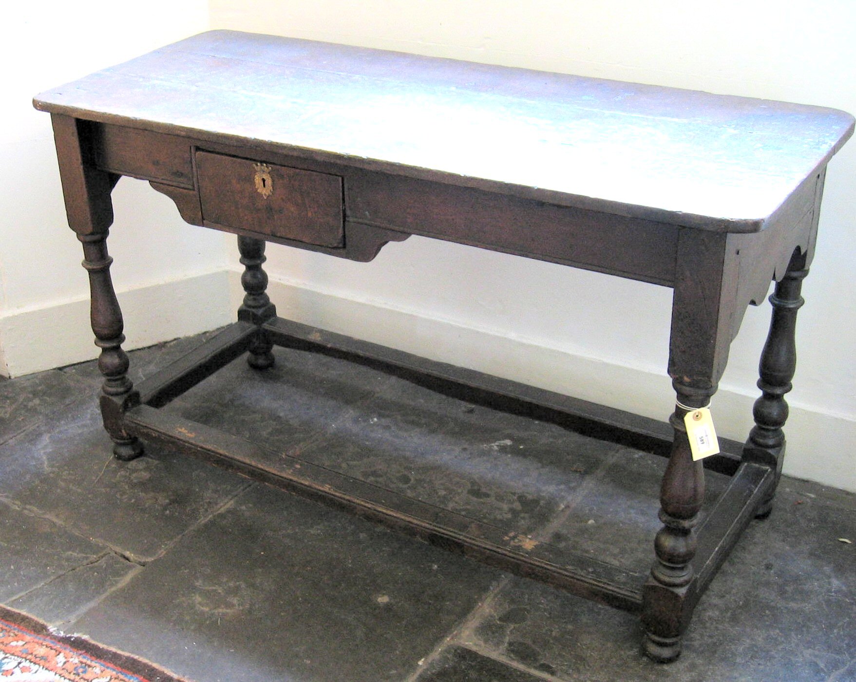 the rectangular plank top above shaped aprons with later drawer at centre, turned and blocked baluster legs joined by stretchers