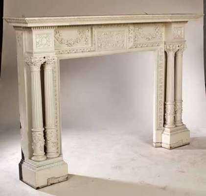 the reverse breakfront mantel above frieze with cartouche panel and festoons, egg and dart moulding, a pair of fluted composite column supports with festooned bases