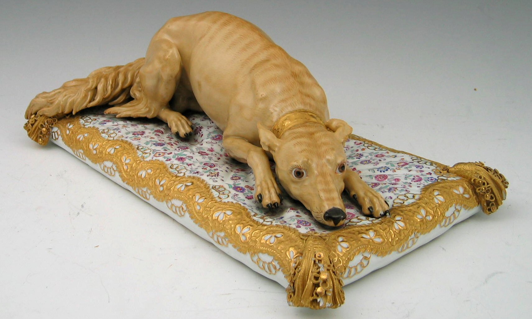 A Dresden model of a recumbent hound on a pillow, early 20th century,