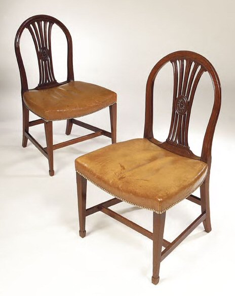 , each with arched back above pierced waisted splat centred by rosette carved roundel, leather stuffover hollow seat, on square section tapered legs with spade feet and H-stretcher, made in 1781 for the Royal Society (18)
