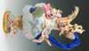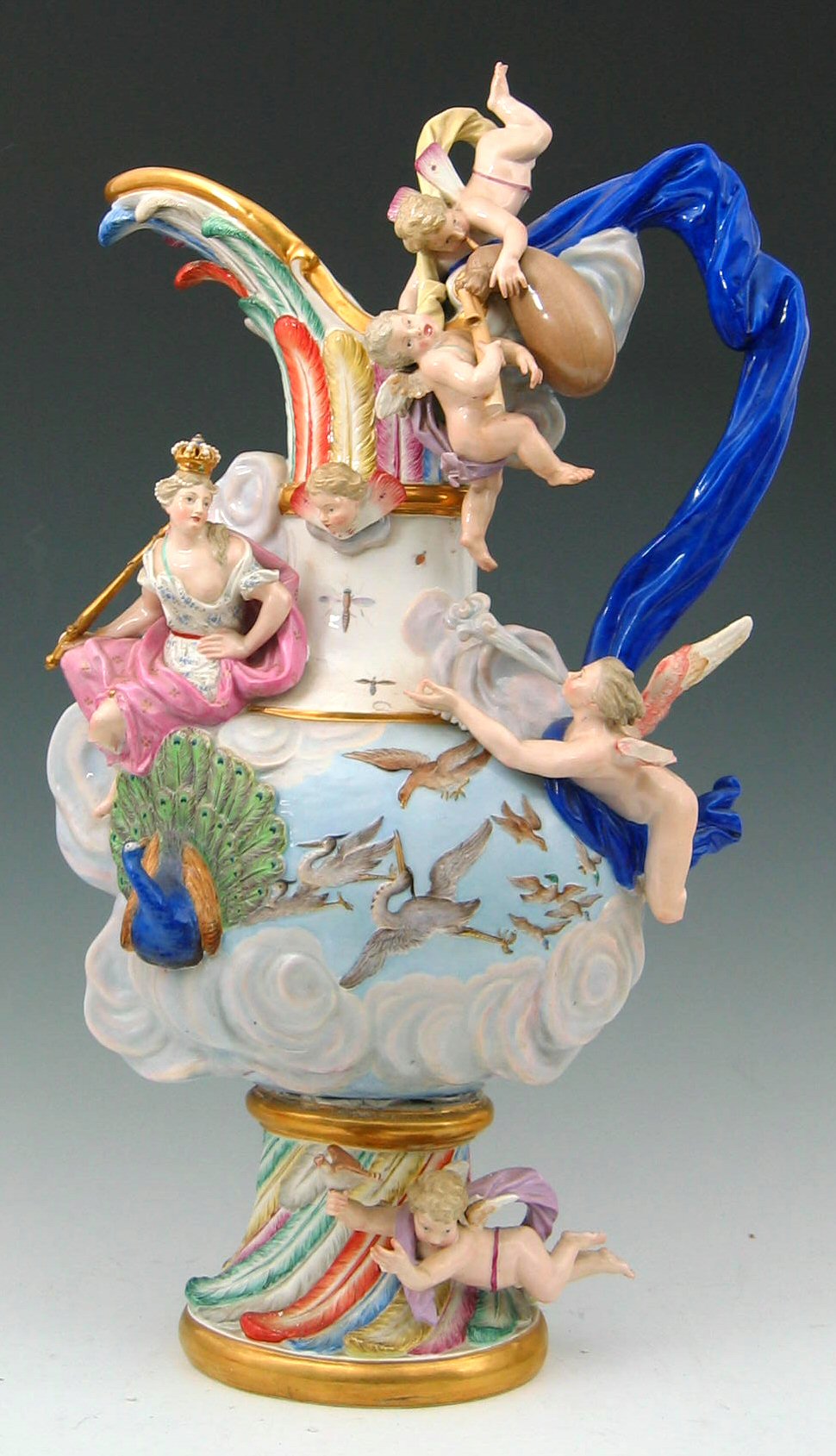 with gilt line to the spout above stiff relief feathers on colours, the handle of simulated deep blue fabric, the neck with insects on a white ground above a baluster body with sky and clouds with painted birds, the clouds partly in relief, the foot with gilt line above and below further stiff feathers, the ewer with relief cherubs, two playing the bagpipes, one blowing wind, one holding a bird, and a queen holding a sceptre, and a peacock