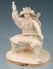 seated on a folding chair, with head-dress, right arm raised holding a command stick, left arm with his hand on his sword and with a quiver of arrows on his back, on a carved plinth, painted and impressed marks