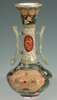 with flared elongated neck above squat body, with band of foliate, floral and geometric patterns, opposed cartouches to the neck decorated with mythical creatures, the body with black ground decorated profusely with flowers, with opposed cartouches, one depicting phoenixes on a red ground, the other with mythical animals on a peach ground, signed on the base