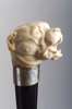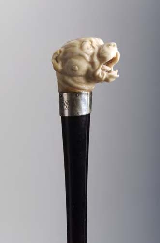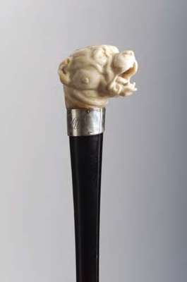 the handle in the form of a mastiff's head with mouth open, with silver band engraved with the initials 'J. C. D.', the shaft with silvered metal ferrule with steel tip