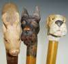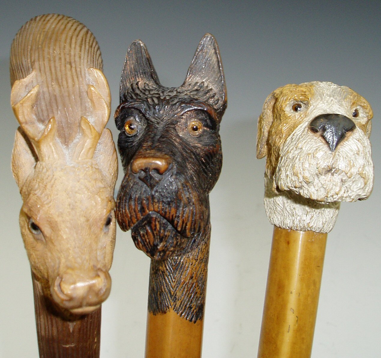 one with handle in the form of a terrier's head, stamped 'Swaine and Adeney, London'; another with handle in the form of a Scottie, makers 'S. Fox and Co. Ltd.'; and another with Black Forest handle in the form of a roebuck head, with gold collar (3)