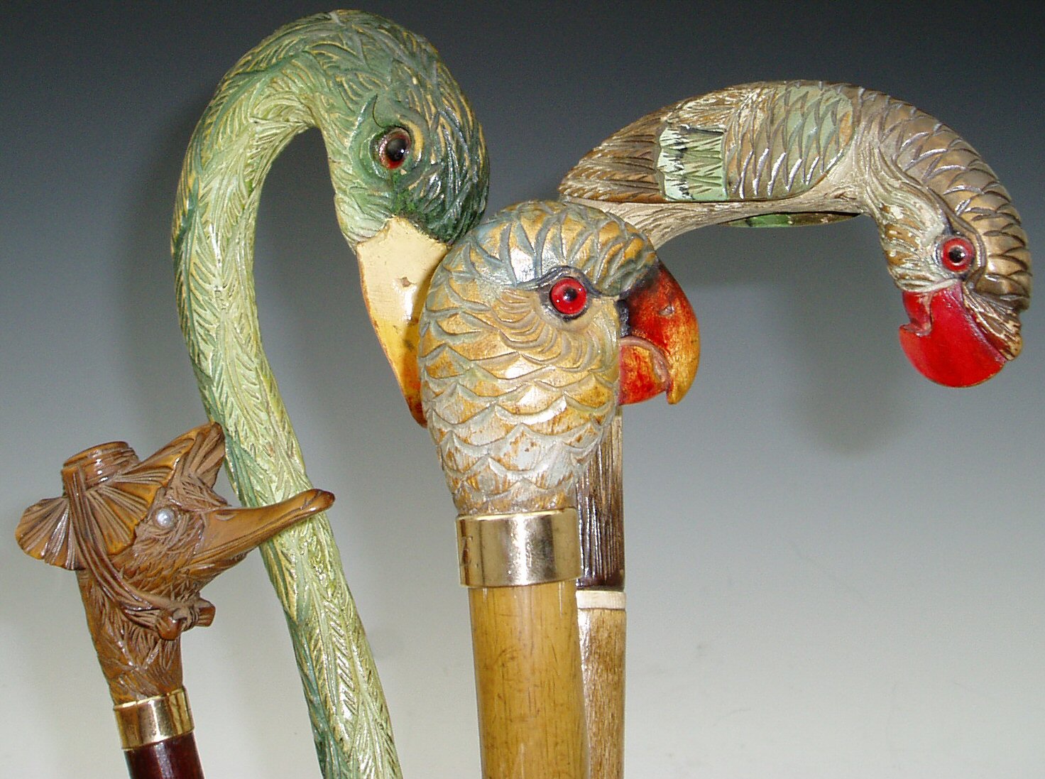 carved with bird's heads, including: two parrots and two ducks, one wearing a bonnet (4)