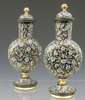 A pair of 19th century Bohemian dark amethyst glass enamelled flasks and covers,