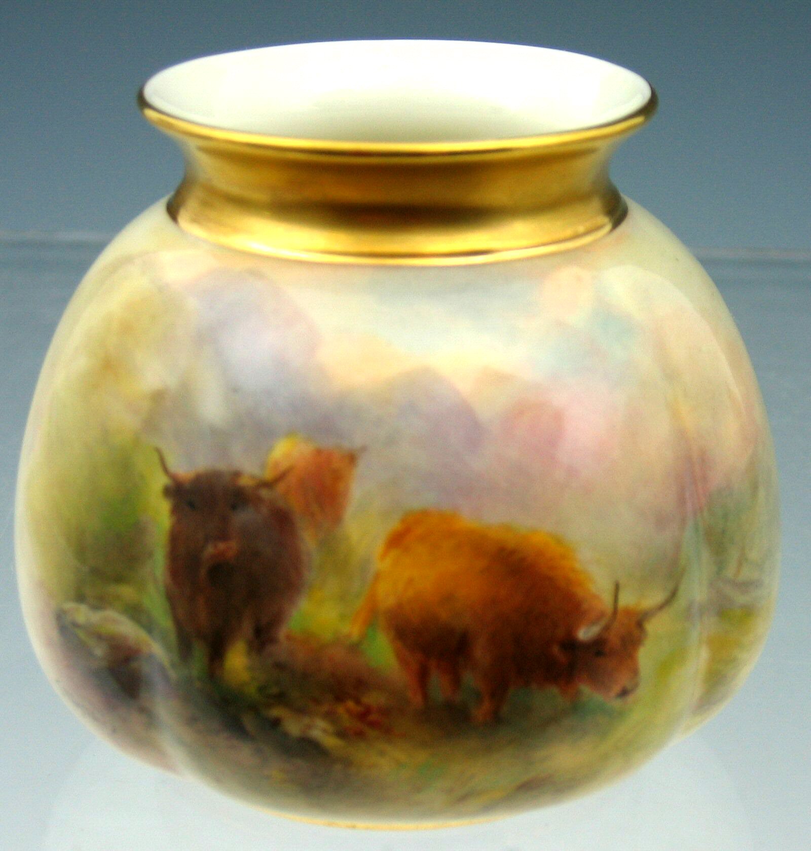 of squat lobed form, with gilt line rim, painted with Highland cattle in a Scottish landscape, signed Stinton, purple printed mark for 1939