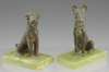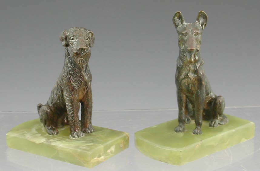 raised on a green onyx base, 14.5cm high; and a patinated bronze figure of an Alsatian, raised on a green onyx base, 15cm high (2)