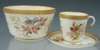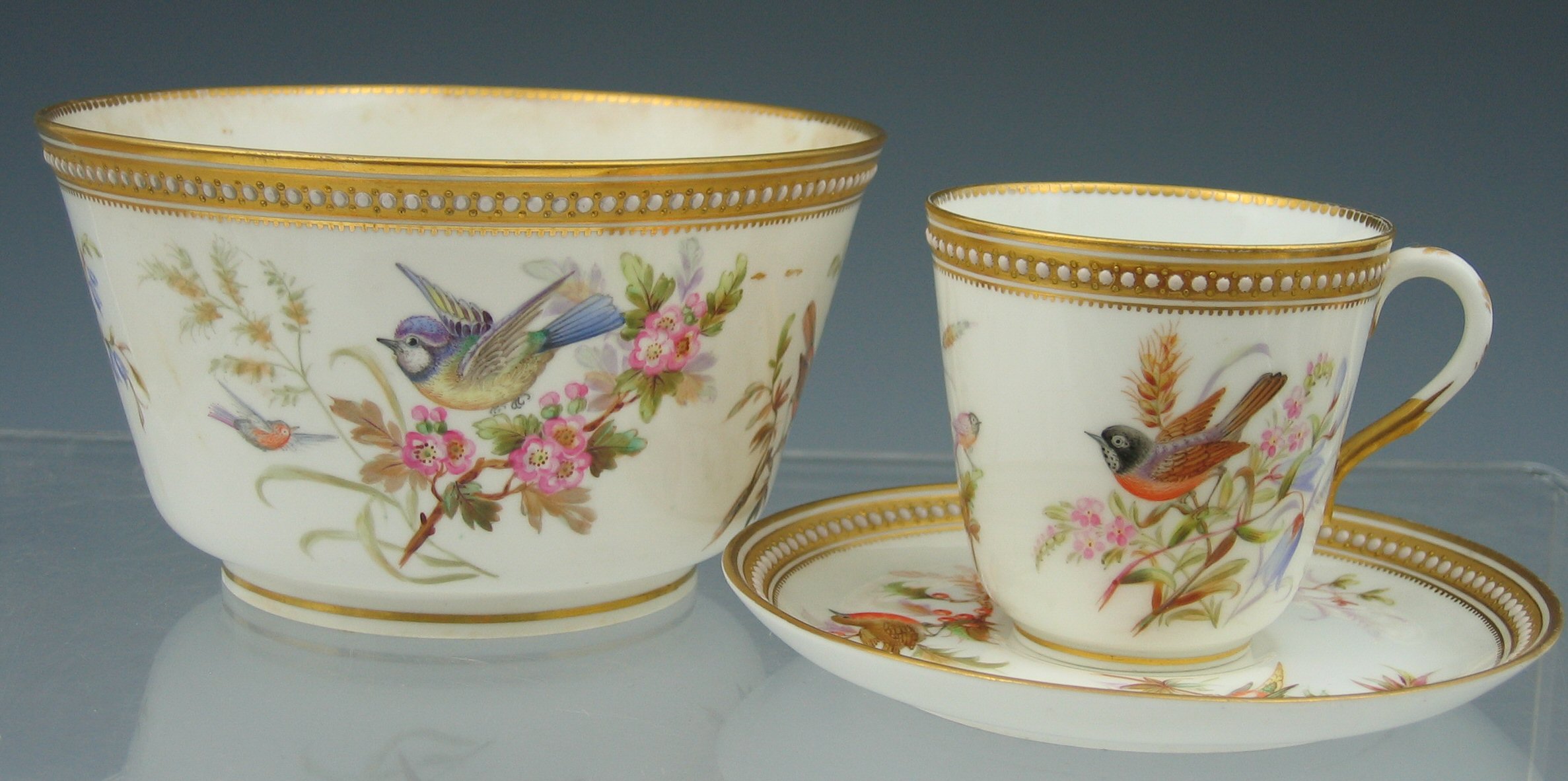 the cups with gilt rims having white beading, painted with various songbirds on flowering branches, comprising: nine cups; thirteen saucers; and a sugar bowl, the cups and sugar bowl with green printed mark, the saucers with puce printed mark, both for 1875 (23)