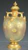 the cover with pointed finial and moulded stylised foliate design, the body with bronzed and gilt moulded foliate design and scroll decorated handles to the neck, above lustre body decorated with panel of gilt leaves and flowers opposed by smaller flower sprig to reverse, above moulded stylised foliage, the foot with stiff leaf decoration, puce printed mark for 1895, the mark encircled by "Worcester Enot Enamels", registered number 209596, pattern number 1654