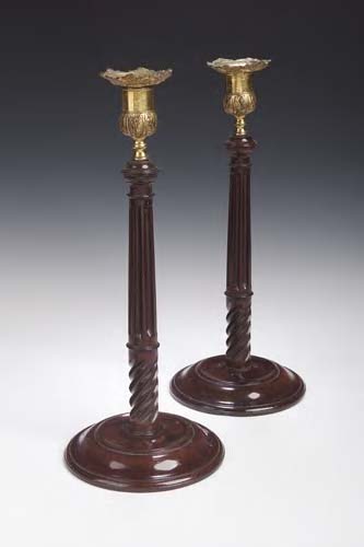 each with cast brass nozzle and removable drip tray, on fluted and spirally fluted column with spreading circular base (2)
