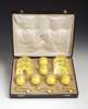 comprising six coffee cups and six saucers, decorated in bright yellow with gilt stylised shell and swag design and white jewelling with gilt interior, handle and well, puce printed mark for 1922, and additional puce printed mark of a Viking long boat, painted mark C899; together with six silver and guilloché enamelled coffee spoons with import marks for London 1903, in a fitted black leather box marked Brook & Son, Goldsmiths to the King, 87 George Street, Edinburgh