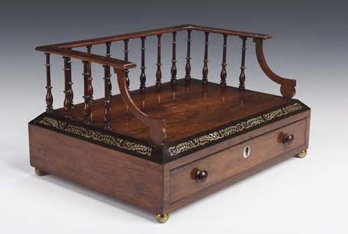 the three quarter spindle gallery above a canted rectangular top with canted angles, inlaid with mother of pearl foliate scrollwork above a single drawer on brass sphere feet