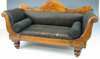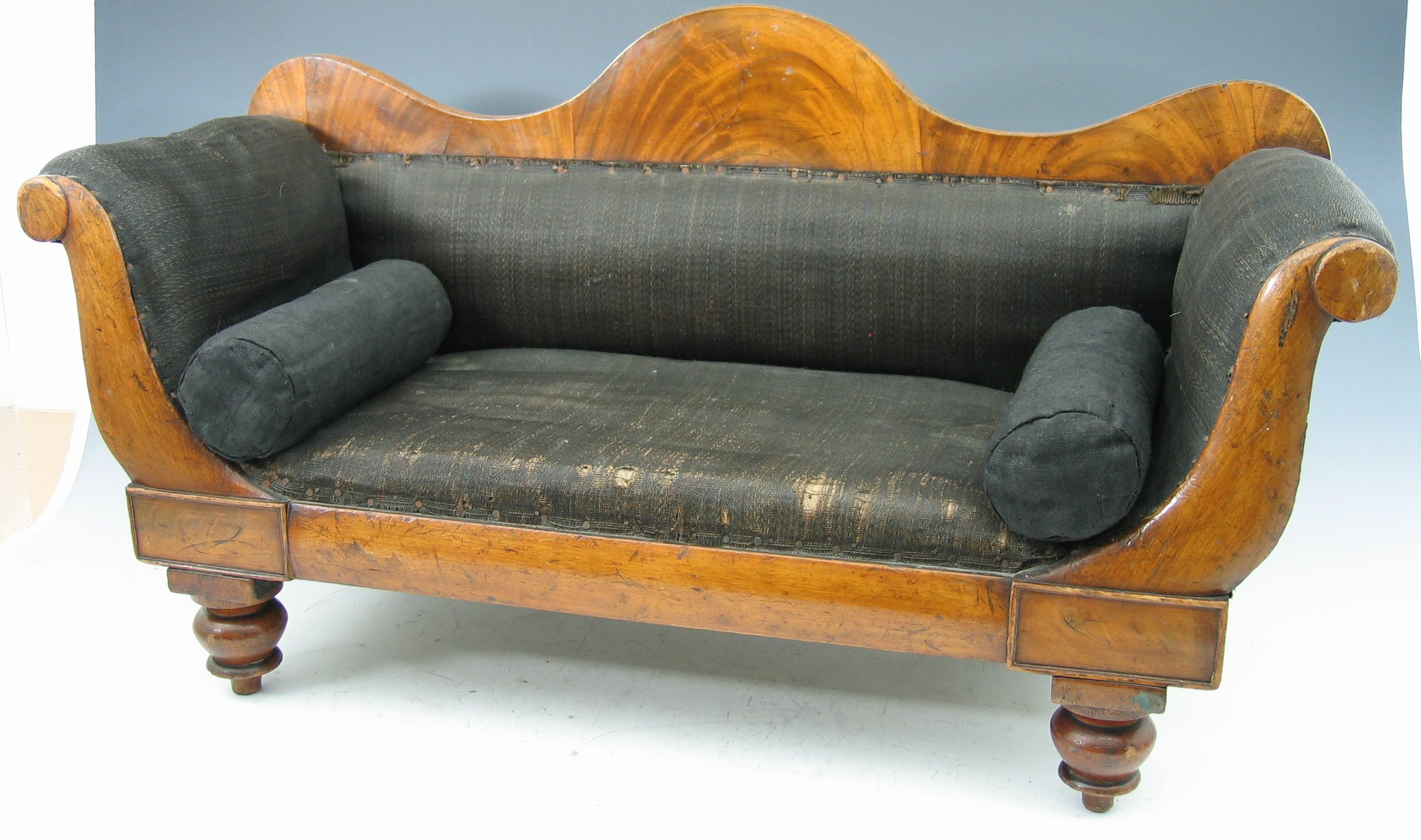 the serpentine back with upholstered panel above outward scrolling arms and upholstered seat with two bolster cushions, the whole raised on turned feet