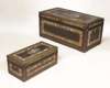 the larger with rectangular hinged lid and studded banding, painted with a border of flowers, the sides similarly decorated, carrying handles, 106cm wide, 48cm wide, 54cm deep; the smaller of similar design (2)