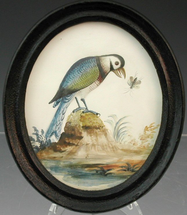 of oval form, depicting a bird perched on a rock, framed and glazed