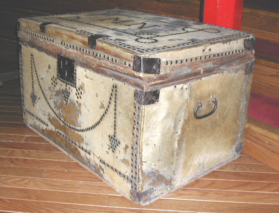 the larger with hide covering and iron straps, the rectangular hinged lid with studded decoration, probably Scottish, 72cm wide, 42cm high, 49cm deep; the smaller with leather covering and brass binding with studded decoration (2)