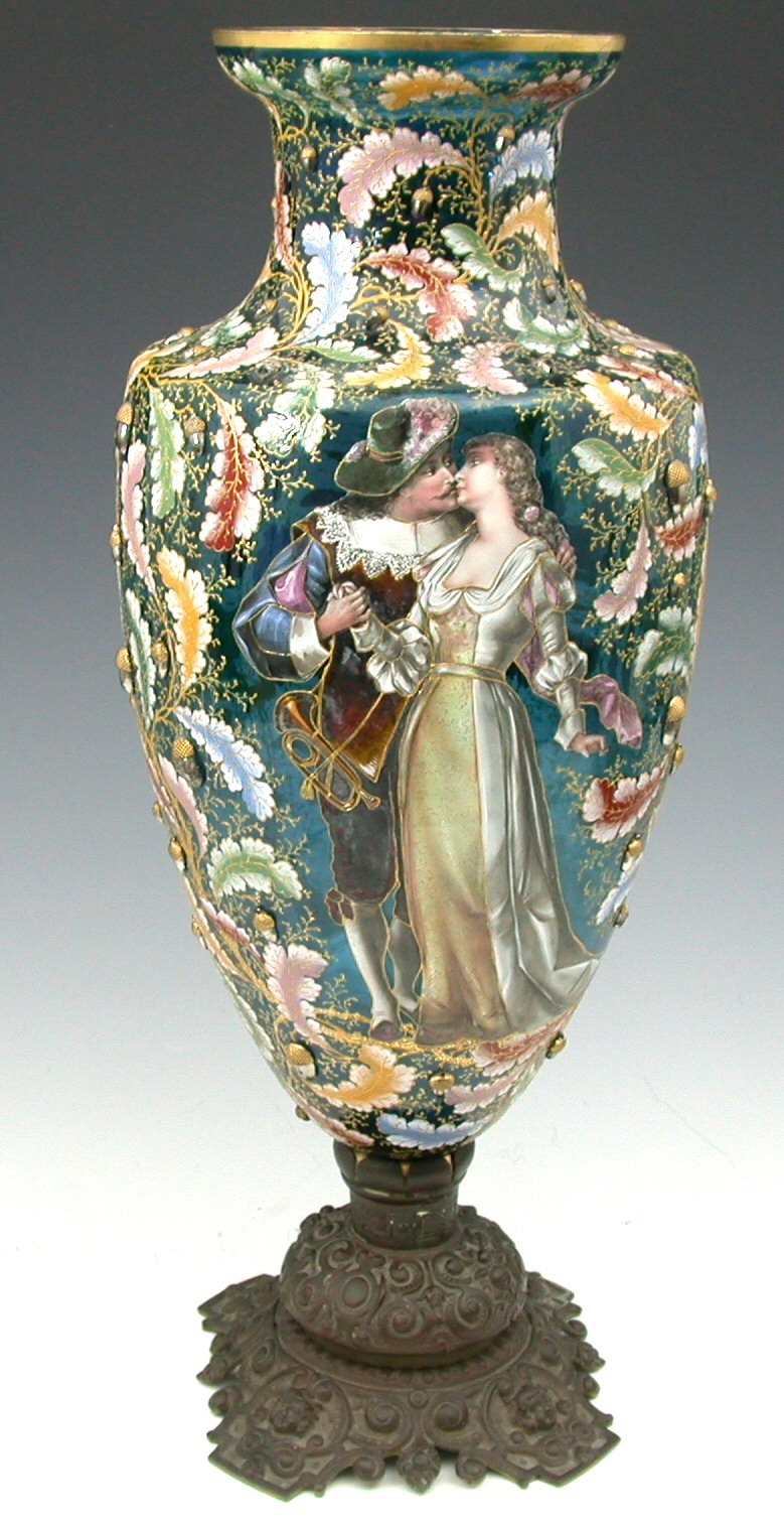 with gilt rim, profusely decorated with gilt branches and polychrome leaves and applied gilt and silvered acorns, with central shaped figure panel printed and painted with a couple in 18th century costume, and with a quatrefoil shaped mask decorated plinth (possibly replacing original glass base)