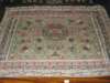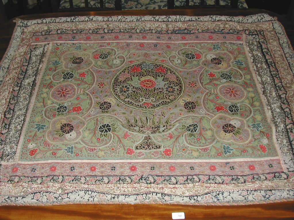 the field worked predominantly in chain stitch in coloured silks with a central stylised flowering jardiniere, and flowerhead spot motifs, reserved against a series of floral embroidered borders, lined in purple satin,