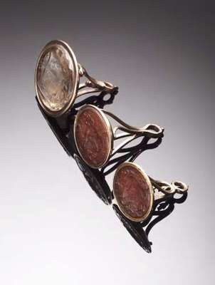 one with oval smoky quartz intaglio bearing the arms of Doddington Egerton (1725-1799), grandson of the 3rd Earl of Bridgewater, granted on his marriage to Catherine Gerrard (Doddington Egerton's death was announced in the Gentleman's Magazine of 1799 'a gentleman of his Majesty's most honourable privy-chamber ... he came down stairs in the morning in apparent good health and more than usual spirits, and died almost instantaneously'), with pierced scroll mount, 32mm high; one with oval cornelian intaglio bearing arms representing the marriage of Scroop (Dodington's younger brother) Egerton's daughter Elizabeth to William Hayter in 1768, open work mount, 28mm high; and another similar bearing the Egerton family arms, 36mm high (3)