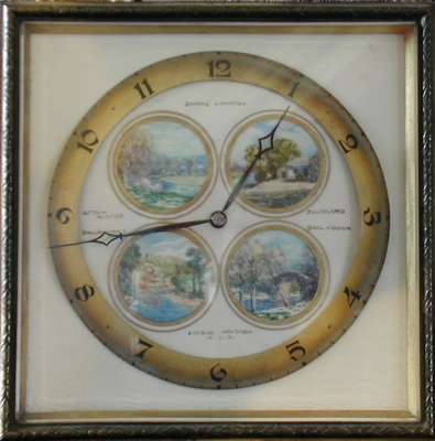 the ivory dial decorated with four watercolour roundels depicting scenes from Burns country, Afton Water, Ellisland, Ballochmyle and Brig o' Doon, contained in a square cast frame