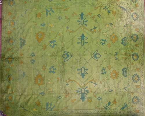 the green field with open pattern of palmettes and vine, within green rosette and vine border between similar bands