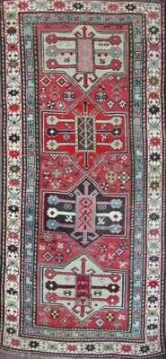 the brick red field with four polychrome medallions, within ivory harshang border with inner blue band