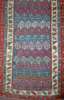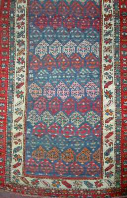 the indigo field with allover pattern of polychrome boteh, within ivory rosette and vine border with two outer bands