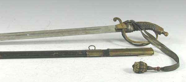 with gilt brass three bar hilt and silver braid sword knot, the pommel with H cypher, the grip bound with brown leather bound with a double twist of brass wire, the single edge blade with double fullers for the length of the 32 inch blade, in original black leather scabbard with brass mounts, two brass hilted sword bayonets in steel scabbards (qty)