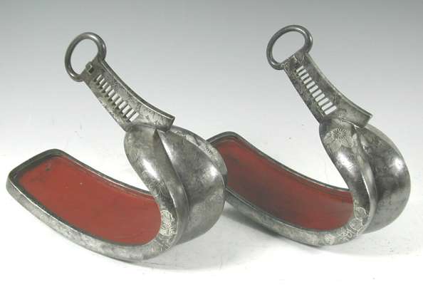 A pair of Japanese stirrups of traditional form with red lacquered wood foot plates,