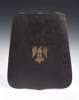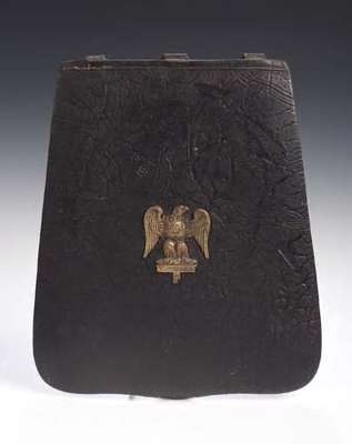 mounted with regimental brass Waterloo Eagle, with enclosed document pocket in lined patent leather, with flap cover with leather strap attachment and brass button catch, with three brass suspension rings at top